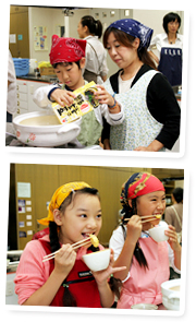 教室に豆乳鍋のおいしそうな香りが充満し出し始めた頃、どの具材も食べ頃になってきました。そして皆さん、一斉に食べ始めると、お子さんもお母さんも想像以上のおいしさに、どんどん箸が進んでいきます。そのままで食べてもおいしいのですが、「ポン酢」「豆板醤」「かんずり」などで味付けをして食べてみた味も大好評でした。