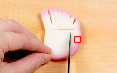 Step2.蒲鉾を縦に置き替え、小さい方に切り込みを入れる。