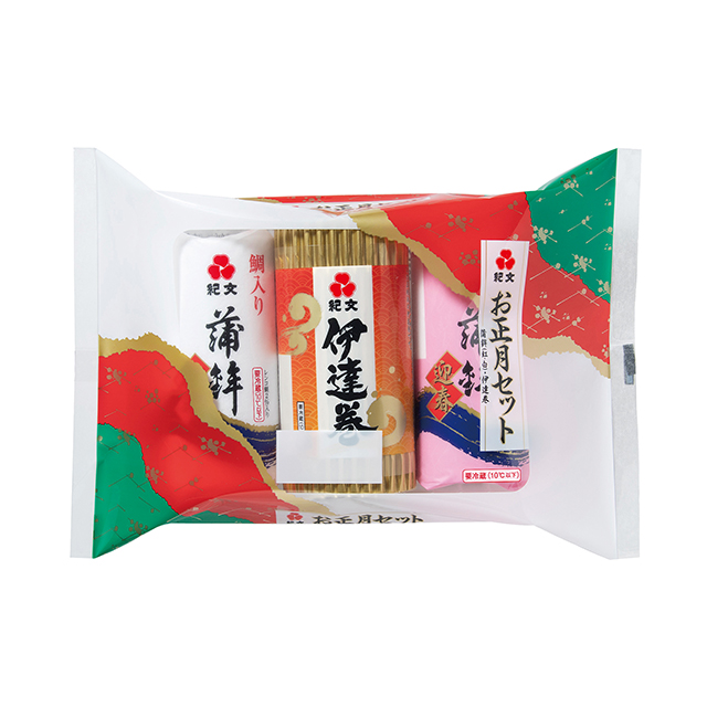 定番おせちの紅白の蒲鉾と伊達巻をセットにしました。