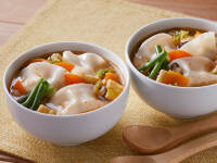 - 4鍋にBを入れ火にかけ、大根、にんじん、里いも、なると、牛肉を加えあたためる。